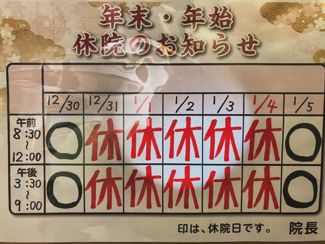 名古屋市緑区大清水「うつの接骨院」です✨2025年も残りわずかとなり、皆様も忙しい日々をお過ごしのことと思います。年末年始の休院日についてご案内いたします。12月31日(大晦日)から1月4日まで休院とさせていただきます。新年は1月5日(月)より受付をはじめますので、何卒よろしくお願いいたします